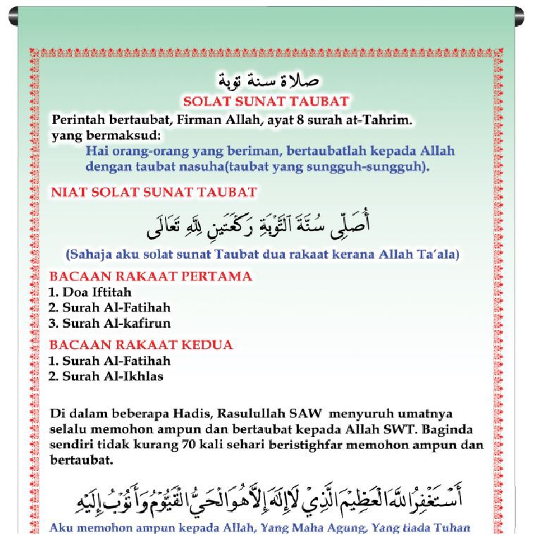 بسم ٱلله ٱلرحمـن ٱلرحيم اللهم صل وسلم على سيدنا محمد Solat Sunat Taubat dilakukan selepas seseorang itu melakukan dosa dan kesalahan atau perlanggaran hukum-hukum agama atau berasa dirinya bersalah dan berdosa kepada Allah SWT. Ejaan dalam rumi juga turut disertakan dalam niat solat qada fardu lima waktu bagi membantu mereka yang sukar membaca tulisan arab. Doa ini juga pernah captain masukkan dalam N3 dahulu.